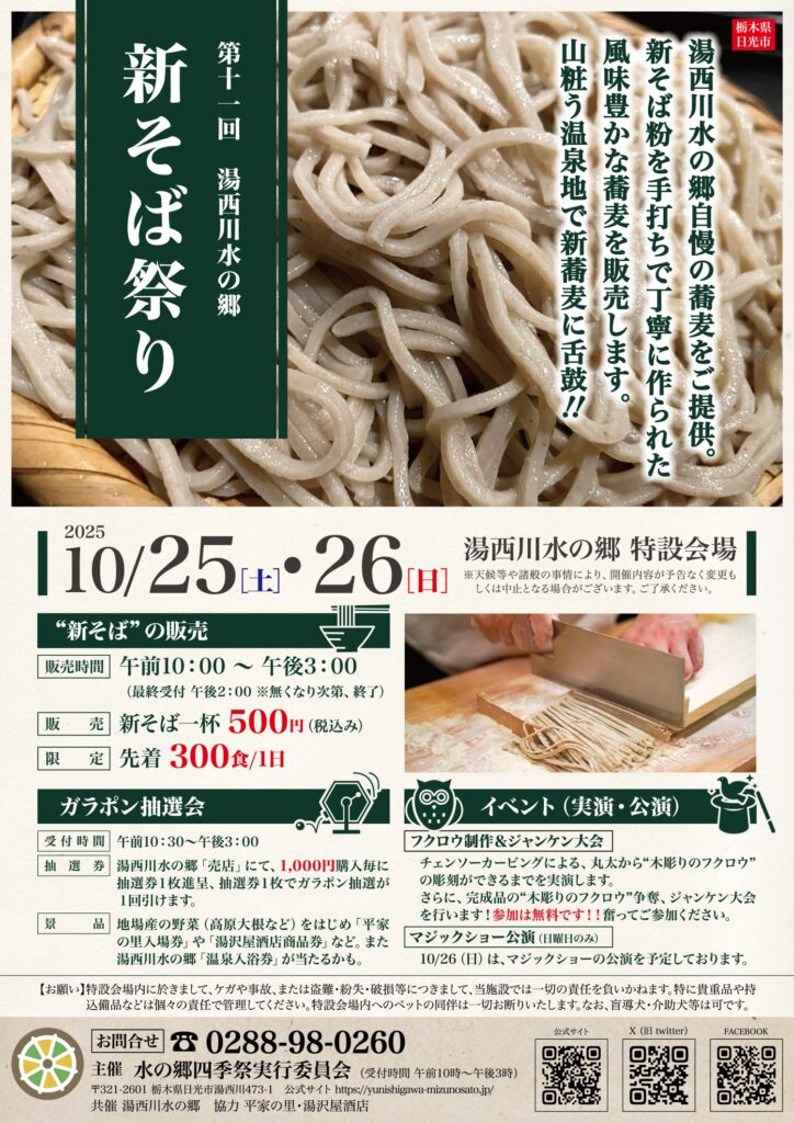 内容 | 【“新そば”の販売】 ○販売時間:午前10:00 ~ 午後3:00 (最終受付 午後2:00 ※無くなり次第、終了) ○販売:新そば一杯 500円(税込み) ○限定:先着 300食/日 【ガラポン抽選会】 ○受付時間:午前10:30~午後3:00 ○抽 選 券:湯西川水の郷「売店」にて、1,000円購入毎に抽選券1枚進呈、抽選券1枚でガラポン抽選が1回引けます。 ○景品:地場産の野菜(高原大根など)をはじめ「平家の里入場券」や「湯沢屋酒店商品券」など。また湯西川水の郷「温泉入浴券」が当たるかも。 【イベント(実演・公演)】 ○フクロウ制作&ジャンケン大会:チェンソーカービングによる、丸太から“木彫りのフクロウ”の彫刻ができるまでを実演します。さらに、完成品の“木彫りのフクロウ”争奪、ジャンケン大会を行います!参加は無料です! ○マジックショー公演(日曜日のみ):10/26(日)は、マジックショーの公演を予定しております。 【お願い】 特設会場内に於きまして、ケガや事故、または盗難・紛失・破損等につきまして、当施設では一切の責任を負いかねます。特に貴重品や持込備品などは個々の責任で管理してください。特設会場内へのペットの同伴は一切お断りいたします。なお、盲導犬・介助犬等は可です。 |