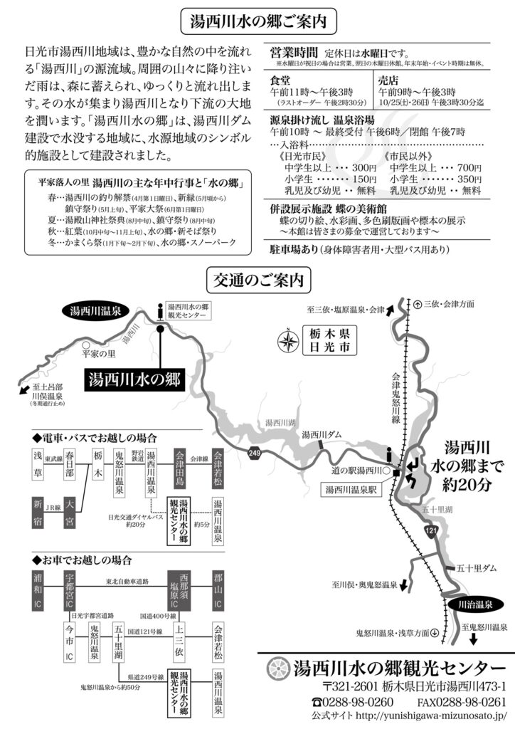 主催、問合せ | ○主催:水の郷四季祭実行委員会 (受付時間 午前10時~午後3時) ☎ 0288-98-0260 〒321-2601 栃木県日光市湯西川473-1 ○共催:湯西川水の郷 ○協力:平家の里・湯沢屋酒店 |